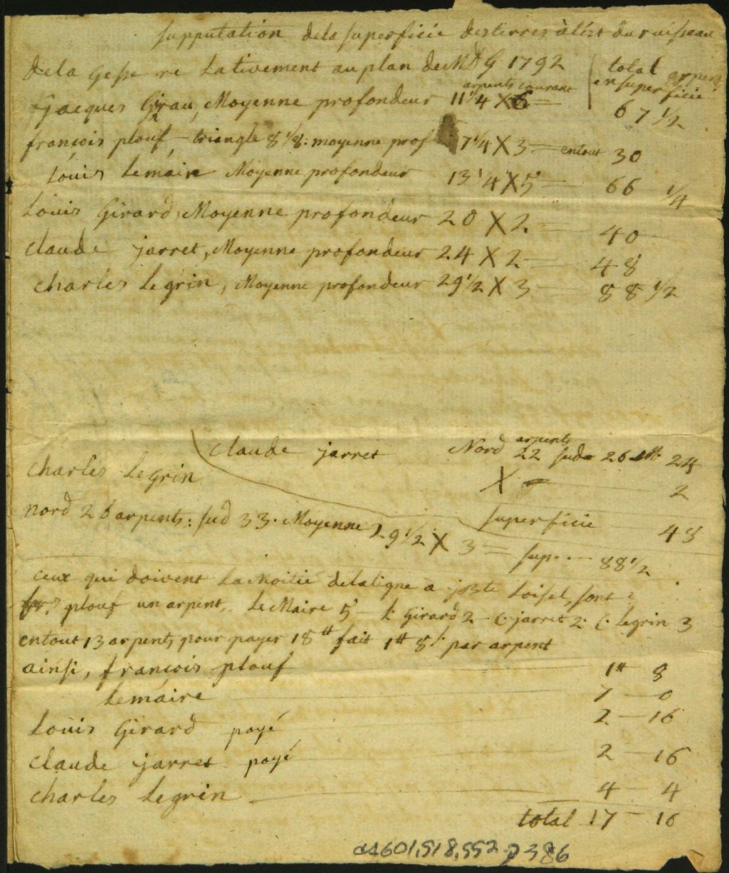 Procès-verbal d'arpentage, à la requête de Pierre Paul Margane, des terres de Claude Janet, Louis Girard, Jean Louis Girau, Charles Legrin, Louis Lemaire, père, et Basile Plouf situées au ruisseau de la Gesse dans la seigneurie de Ramezay, 29 juillet 1792, Archives nationales à Montréal, Fonds Cour supérieure. District judiciaire de Montréal. Greffes d'arpenteurs, (06M,CA601,S18,SS2,D386).