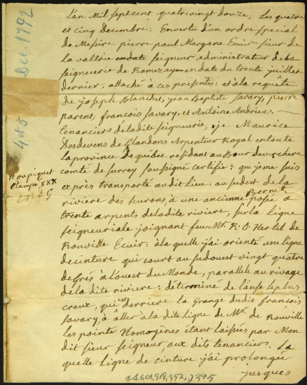 Procès-verbal de bornage, en vertu d'un ordre de Pierre Paul Margane, sieur de Lavaltrie, seigneur administateur de la seigneurie de Ramezay, et à la requête d'Antoine Andrieu, Joseph Blanchet, Pierre Parent et François et Jean Baptiste Savary, d'un emplacement situé au Sud-Est de la rivière des Hurons dans la seigneurie de Ramezay, 4 décembre 1792-5 décembre 1792, Archives nationales à Montréal, Fonds Cour supérieure. District judiciaire de Montréal. Greffes d'arpenteurs, (06M,CA601,S18,SS2,D395).
