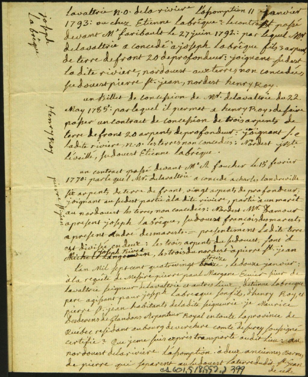 Procès-verbal de bornage, à la requête de Pierre Paul Margane, seigneur de Lavaltrie, de terres situées au Nord-Ouest de la rivière l'Assomption dans la dite seigneurie et appartenant à Joseph Labrecque, J.B. Rivet, Henry Roy et Pierre Saint-Jean, 12 janvier 1793-16 janvier 1793, Archives nationales à Montréal, Fonds Cour supérieure. District judiciaire de Montréal. Greffes d'arpenteurs, (06M,CA601,S18,SS2,D399).