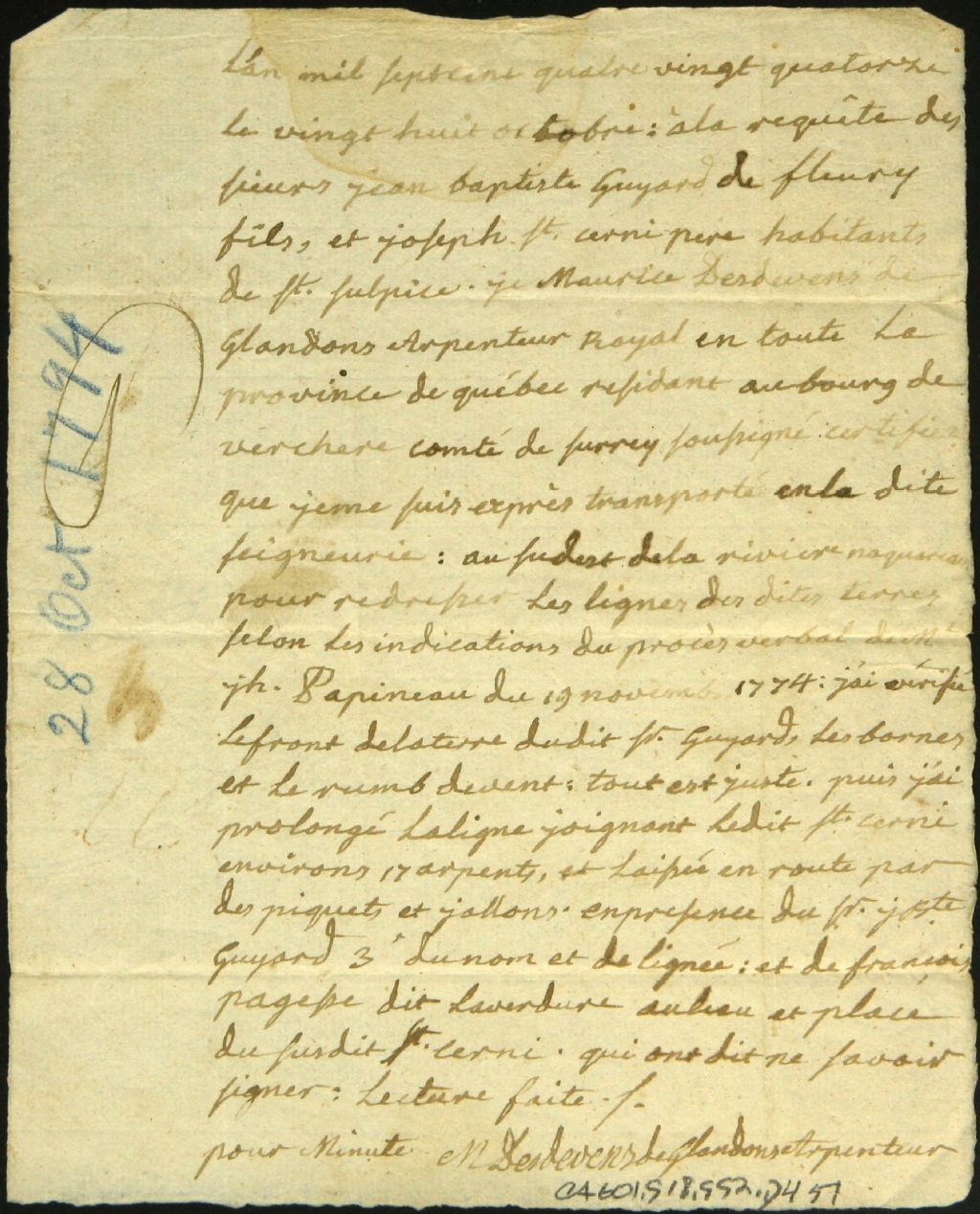 Procès-verbal d'arpentage, à la requête de Jean Baptiste Guyard de Fleury, fils, et Joseph Saint-Cerni, père, d'un emplacement situé au Sud-Est de la rivière Naquereau dans la seigneurie de Saint-Sulpice, 28 octobre 1794, Archives nationales à Montréal, Fonds Cour supérieure. District judiciaire de Montréal. Greffes d'arpenteurs, (06M,CA601,S18,SS2,D451).