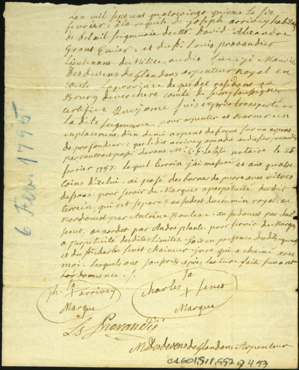 Procès-verbal d'arpentage et de bornage, à la requête de Joseph Arrivey et Louis Provandier, lieutenant de la milice, d'un emplacement situé à Beloeil dans la seigneurie de David Alexander Grant, 6 février 1795, Archives nationales à Montréal, Fonds Cour supérieure. District judiciaire de Montréal. Greffes d'arpenteurs, (06M,CA601,S18,SS2,D453).