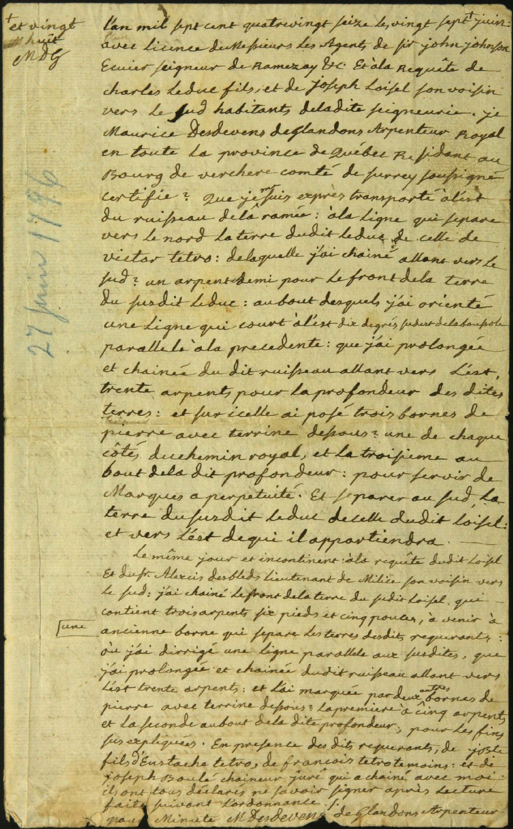 Procès-verbal d'arpentage et de bornage, à la requête de Charles Leduc, fils, et Joseph Loisel, d'un emplacement situé à l'Est du ruisseau de Laramée dans la seigneurie de Ramezay, 27 juin 1796-juillet 1796, Archives nationales à Montréal, Fonds Cour supérieure. District judiciaire de Montréal. Greffes d'arpenteurs, (06M,CA601,S18,SS2,D507).