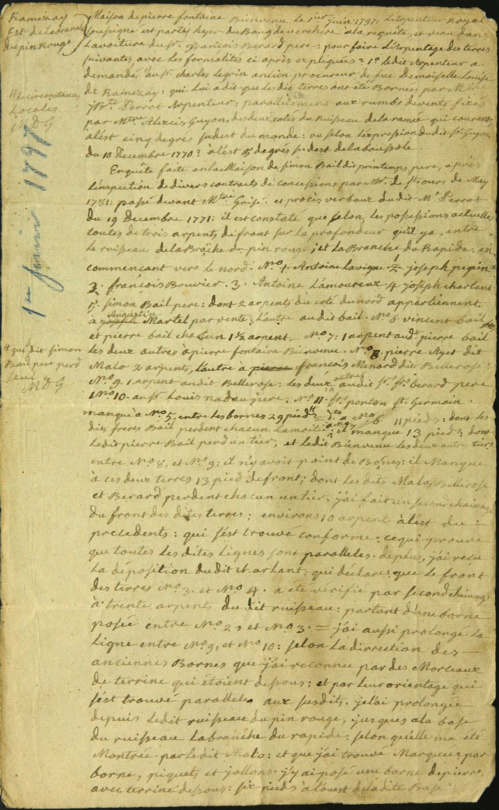 Procès-verbal de bornage des terres de Pierre Ayet Malo, Pierre, Simon et Vincent Bail, François Bérard, père, Joseph Charlant, Pierre Fontaine Bienvenu, Augustin Martel, François Ménard Bellerose et Louis Nadau, père, situées à l'Est de la branche du Pin rouge dans la seigneurie de Ramezay, 31 mai 1797-1 juin 1797, Archives nationales à Montréal, Fonds Cour supérieure. District judiciaire de Montréal. Greffes d'arpenteurs, (06M,CA601,S18,SS2,D524).