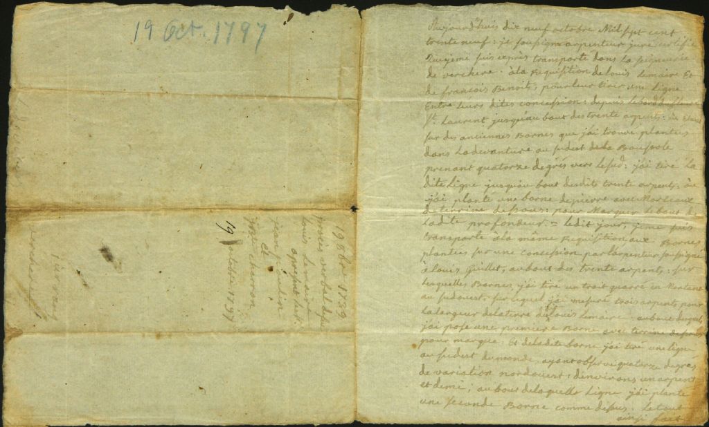 Procès-verbal de bornage, à la requête de François Benoît et Louis Lemaire, d'un emplacement situé dans le 1er Rang de la seigneurie de Verchères, 19 octobre 1797, Archives nationales à Montréal, Fonds Cour supérieure. District judiciaire de Montréal. Greffes d'arpenteurs, (06M,CA601,S18,SS2,D532).