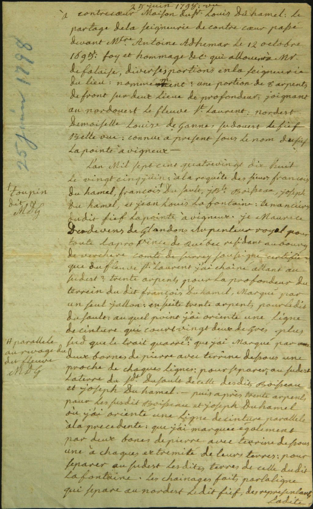 Procès-verbal d'arpentage et de bornage, à la requête de Jean Baptiste Boisseau, François et Joseph Duhamel, François Dussault et Jean Louis Lafontaine, de terres situées à la Pointe à Vigneux (Contrecoeur), 25 juin 1798-27 juin 1798, Archives nationales à Montréal, Fonds Cour supérieure. District judiciaire de Montréal. Greffes d'arpenteurs, (06M,CA601,S18,SS2,D537).