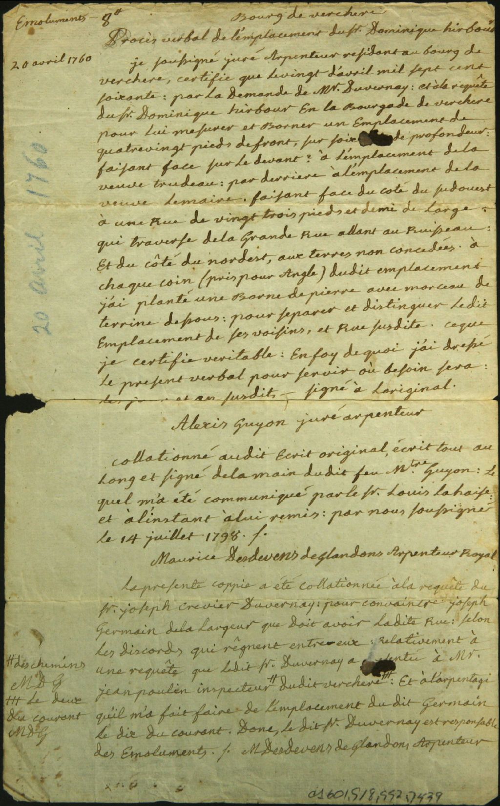 Procès-verbal de bornage et de mesurage, à la requête de Joseph Crevier Duvernay, d'un emplacement qui traverse de la grande rue jusqu'au ruisseau dans le bourg de Verchères, 14 juillet 1798, Archives nationales à Montréal, Fonds Cour supérieure. District judiciaire de Montréal. Greffes d'arpenteurs, (06M,CA601,S18,SS2,D539).