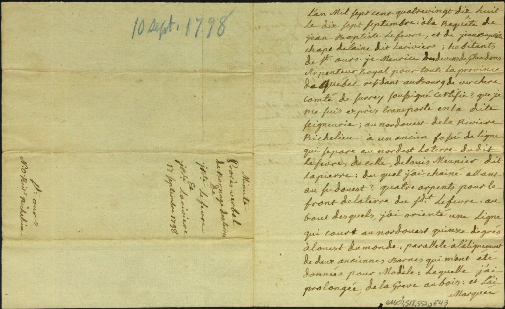 Procès-verbal de bornage, à la requête de Jean Baptiste Chapdelaine dit Larivière et Jean Baptiste Lefebvre, d'un emplacement situé au Nord-Ouest de la rivière Richelieu dans la seigneurie de Saint-Ours, 17 septembre 1798, Archives nationales à Montréal, Fonds Cour supérieure. District judiciaire de Montréal. Greffes d'arpenteurs, (06M,CA601,S18,SS2,D543).