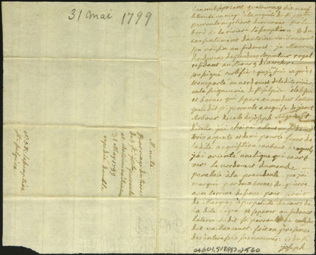 Procès-verbal de bornage, à la requête de Jean Baptiste Perrault et à la suite du consentement d'Antoine Vaillancourt, d'un emplacement situé au Nord-Ouest de la rivière l'Assomption dans la seigneurie de Saint-Sulpice, 31 mai 1799, Archives nationales à Montréal, Fonds Cour supérieure. District judiciaire de Montréal. Greffes d'arpenteurs, (06M,CA601,S18,SS2,D560).