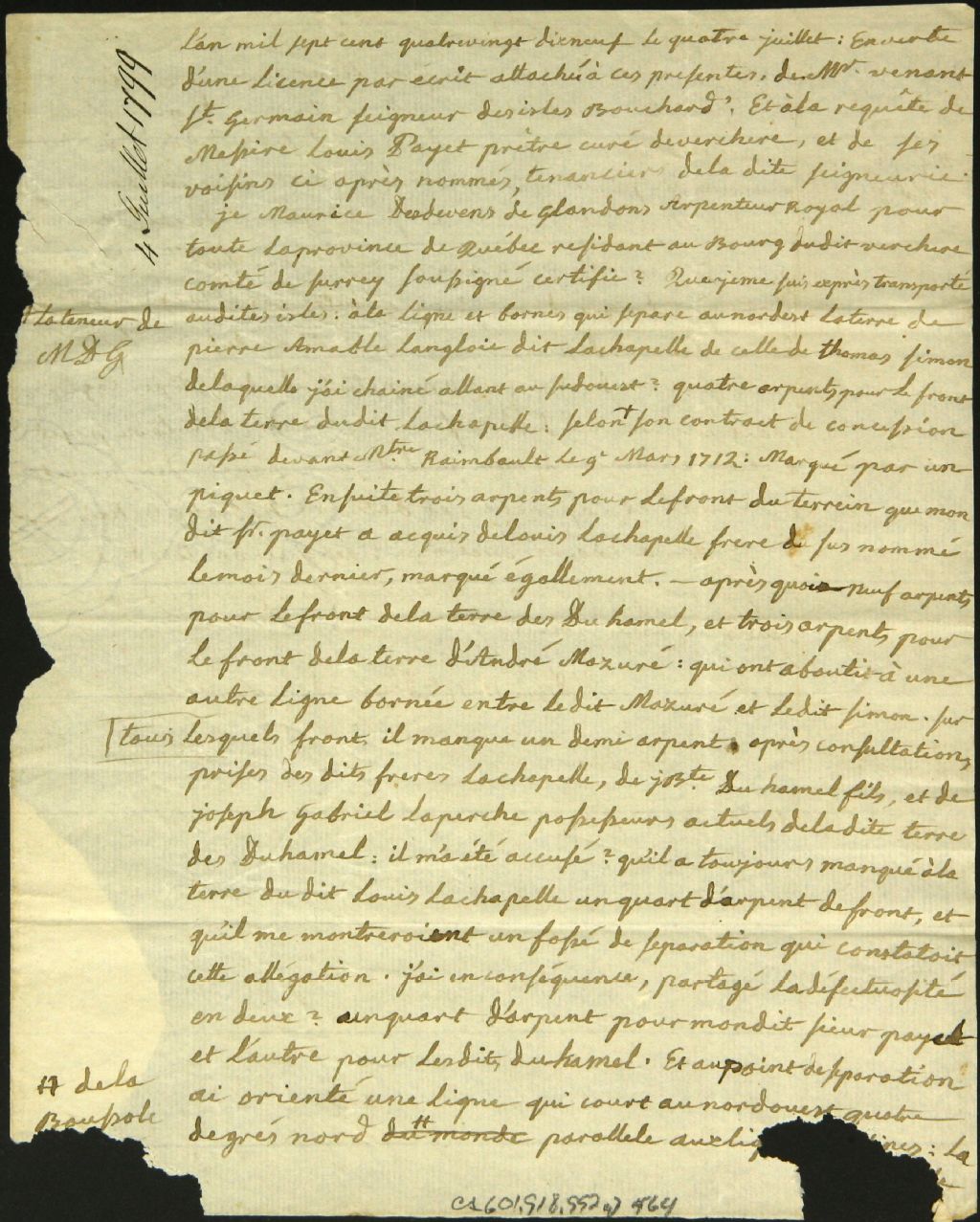 Procès-verbal de bornage, à la requête de Louis Payet, prêtre et curé de Verchères, d'un emplacement situé aux îles Bouchard, 4 juillet 1799, Archives nationales à Montréal, Fonds Cour supérieure. District judiciaire de Montréal. Greffes d'arpenteurs, (06M,CA601,S18,SS2,D564).