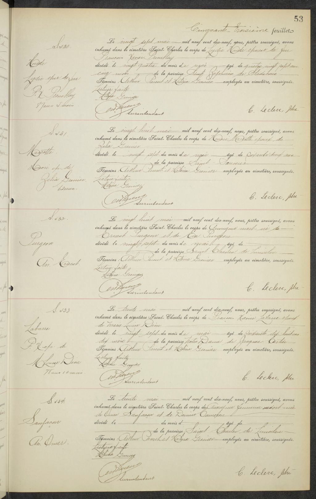 - Registres de la Compagnie du cimetière Saint-Charles contenant les sépultures de certaines paroisses dont Saint-Roch-de-Québec (CE301,S22) ; Notre-Dame-de-Jacques-Cartier (CE301,S33) ; Saint-Sauveur (CE301,S96) ; Saint-Zéphirin-de-Stadacona (CE301,S101) ; Saint-Charles-de-Limoilou (CE301,S117) et Saint-Angèle-de-Saint-Malo (CE301,S118) à partir de 1914