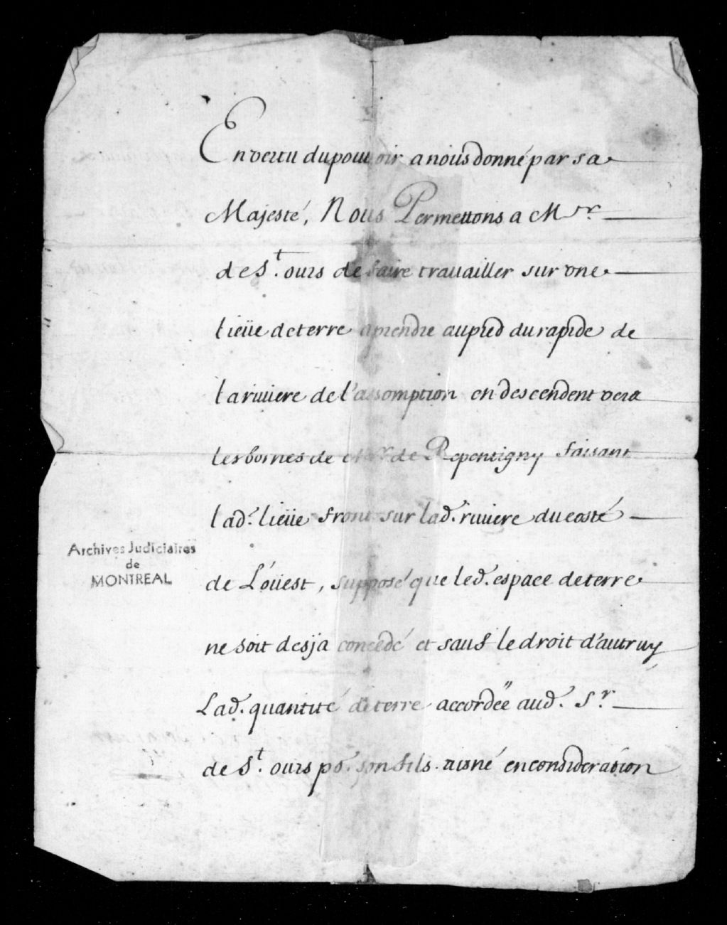 Concession d'une terre d'une lieue de front à Monsieur de Saint-Ours, située sur la rivière L'Assomption et la seigneurie de Repentigny, 26 septembre 1672, Archives nationales à Montréal, Fonds seigneuries de la région de Montréal, (06M,P167,S14,D2).