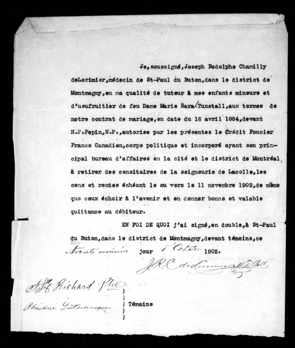 Autorisation pour retirer les rentes seigneuriales, 1902, Archives nationales à Montréal, Fonds seigneuries de la région de Montréal, (06M,P167,S10,D8).
