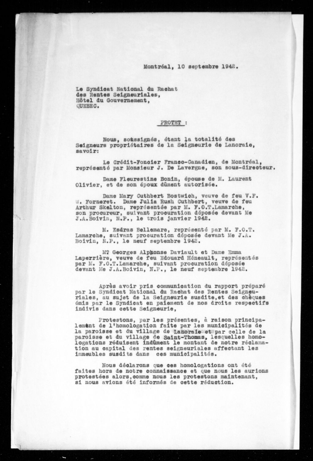 Protestation des seigneurs propriétaires de la seigneurie de Lanoraie, du Crédit foncier franco-canadien, etc. contre certaines décisions du Syndicat national de rachat des rentes seigneuriales