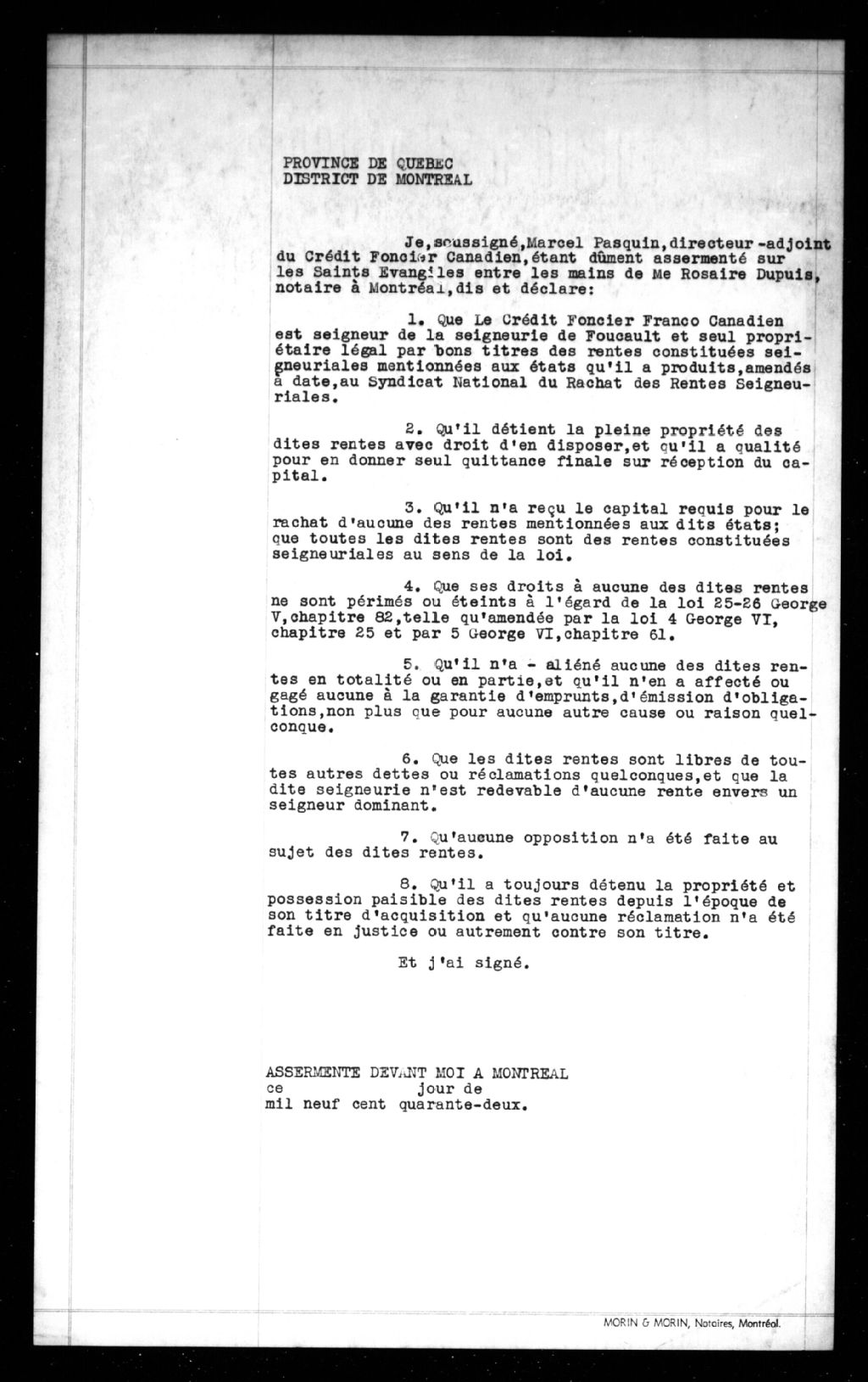 Assermentation du sous-directeur du Crédit foncier franco-canadien comme seigneur et seul propriétaire légal de la seigneurie