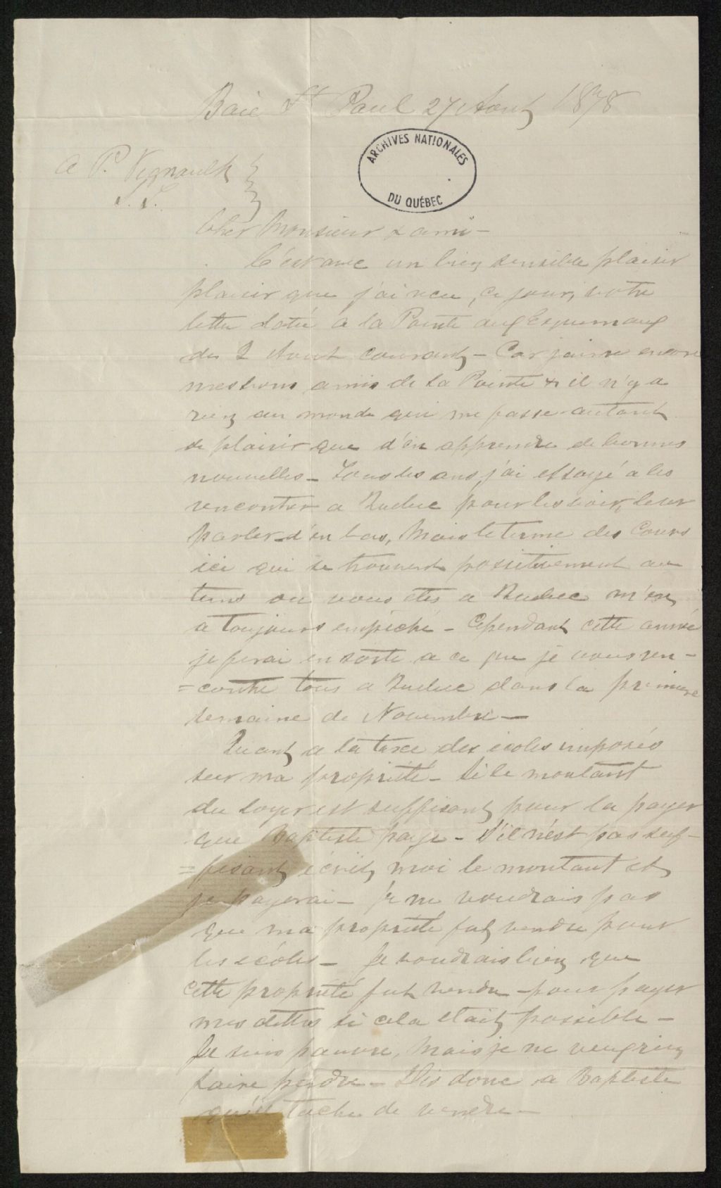 - Le dossier contient de la correspondance personnelle de Placide Vigneau en provenance de Charles Gagnon avocat de Baie-Saint-Paul qui fut magistrat du district de Saguenay (des Îlets-Jérémie à Blanc-Sablon) de 1873 à 1876. La correspondance concernant les taxes et la vente de sa propriété et des nouvelles générales.
