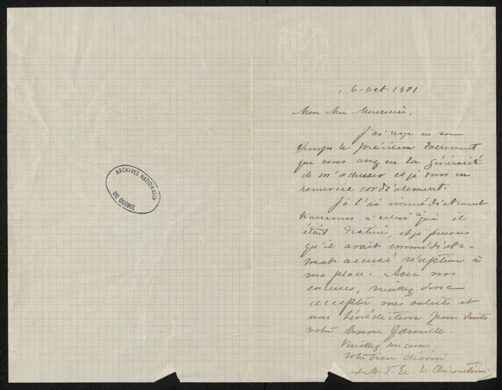 Le dossier contient de la correspondance personnelle de Placide Vigneau en provenance de l'évêque de Chicoutimi, Michel-Thomas Labrecque, qui accuse réception d'un document.