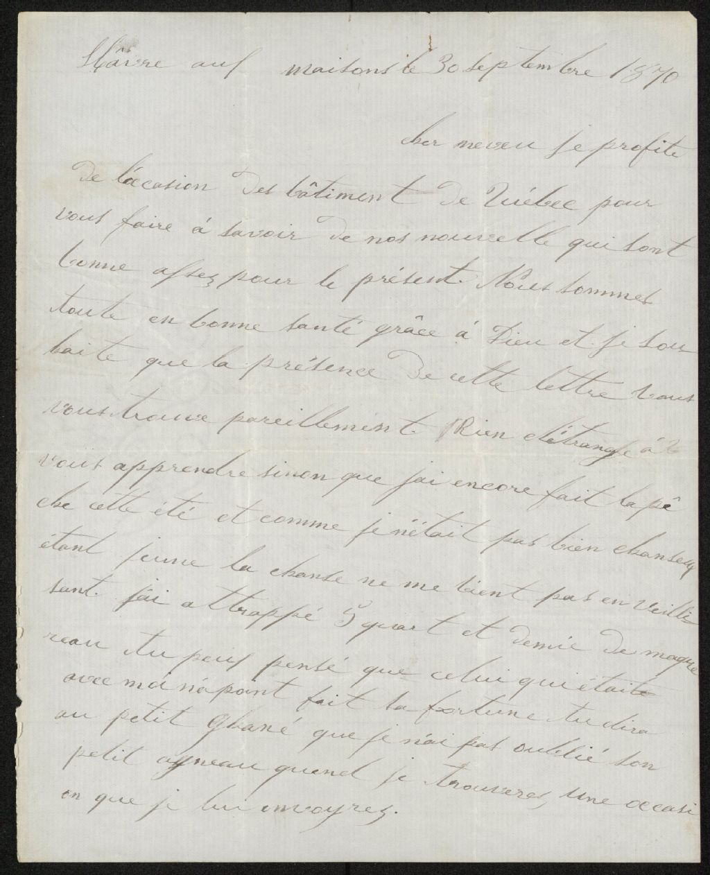 - Le dossier contient de la correspondance personnelle de Placide Vigneau en provenance de Sébastien Richard de Havre-aux-Maisons, Îles-de-la-Madeleine et oncle de Placide (époux de Louise Marie-Anne Vigneau). La correspondance témoigne de nouvelles générales et familiales.