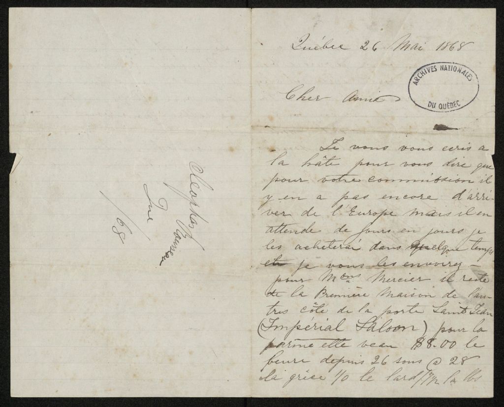 - Le dossier contient de la correspondance personnelle de Placide Vigneau en provenance de Cléophas Rousseau de Québec concernant l'achat de produits et de denrées, l'envoi de montants d'argent, nouvelles générales (salutations, santé).