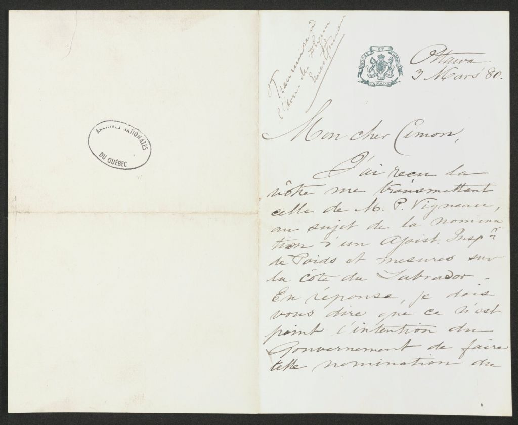 - Lettre du député de Joliette et ministre du Revenu intérieur, Louis-François-Georges Baby, adressée à Ernest Cimon, député de Chicoutimi-Saguenay, concernant la nomination d'un assistant inspecteur de poids et mesures sur la Côte-Nord du Labrador.