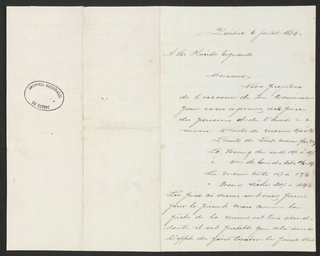 - Le dossier contient de la correspondance personnelle de Placide Vigneau en provenance des marchands de Québec Leclerc et Letellier concernant le prix des poissons (hareng, morue) et des huiles (morue, loup-marin), l'envoi de denrées et le cours de l'argent américain. Le dossier contient également deux publicités suites aux améliorations et aux changements effectués dans leur établissement.