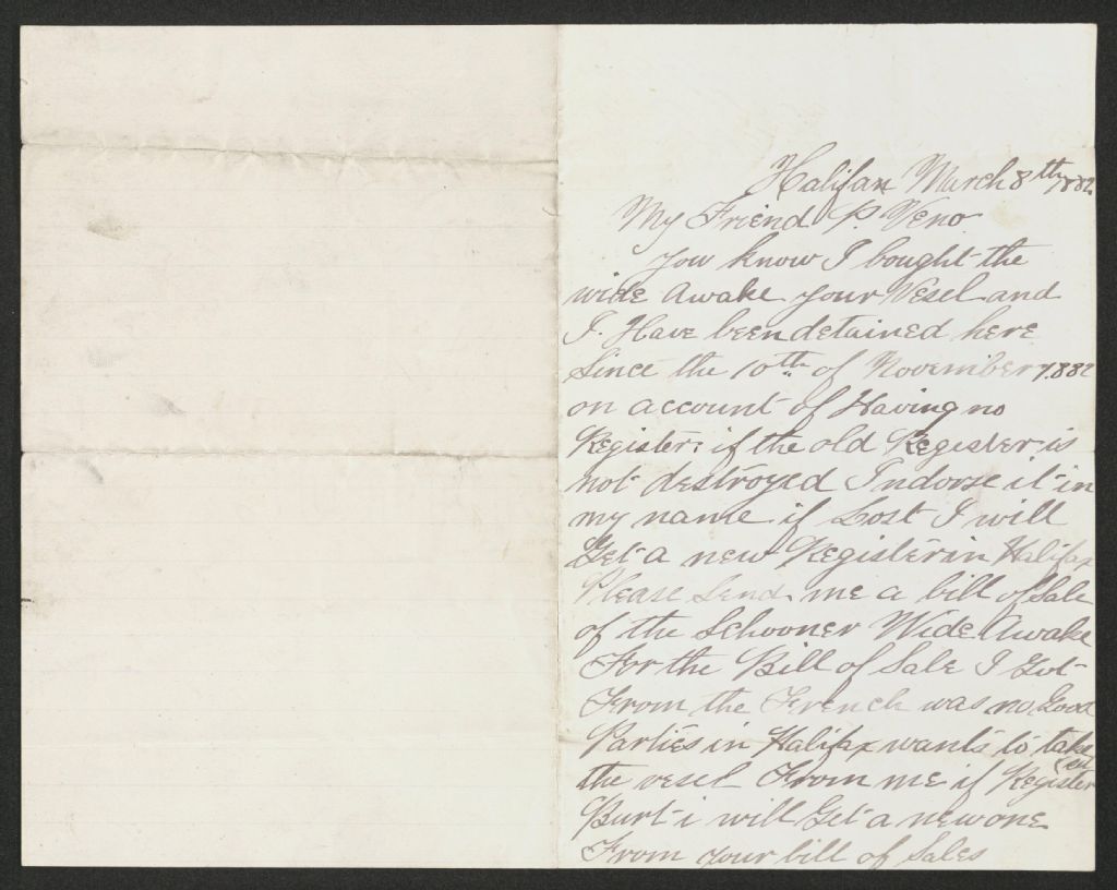 - Le dossier contient de la correspondance personnelle de Placide Vigneau en provenance du capitaine William Messervey d'Halifax, Nouvelle-Écosse, concernant l'achat de la goélette Wide Awake, son registre et un acte de vente.
