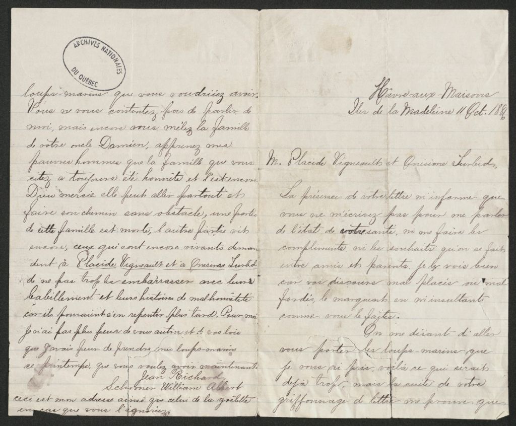 - Le dossier contient de la correspondance personnelle de Placide Vigneau en provenance de Jean Richard, fils de Damien Richard et Angélique-Véronique Vigneau de Havre-aux-Maisons, Îles-de-la-Madeleine, concernant un conflit sur la chasse aux loups-marins.