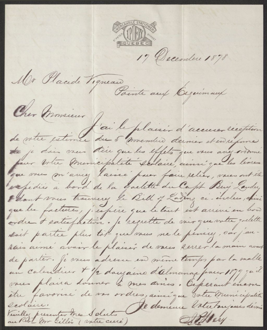 - Le dossier témoigne de commandes de livres de Placide Vigneau à la librairie I. P. Déry de Québec. Le dossier contient de la correspondance, des comptes à payer et une publicité concernant des commandes de livres, une demande pour faire relier des livres et commandes d'autres effets pour la municipalité scolaire de la Pointe-aux-Esquimaux.