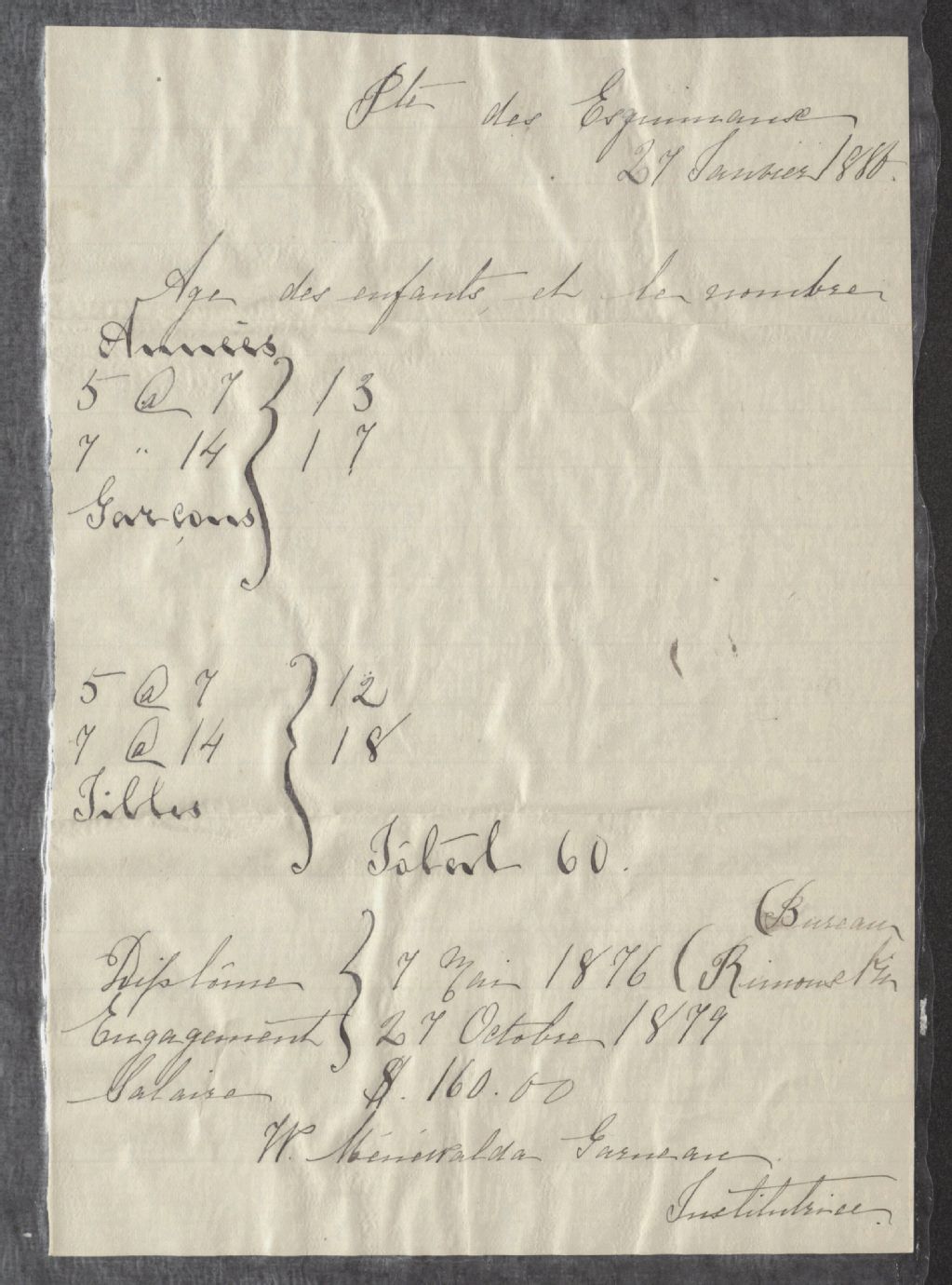 Le dossier contient un document de l'institutrice Marie Elmina Wilhelmine Garneau, dite Mennie Walda, Minie Welda ou Ménéwalda, fille de Pierre Garneau et Florence Lavoie, institutrice à Pointe-aux-Esquimaux de septembre 1879 à juin 1882 pour l'école de l'arrondissement no. 2. Le dossier contient un document sur le nombre et l'âge des élèves, garçons et filles, l'année d'obtention de son diplôme, son engagement et son salaire.