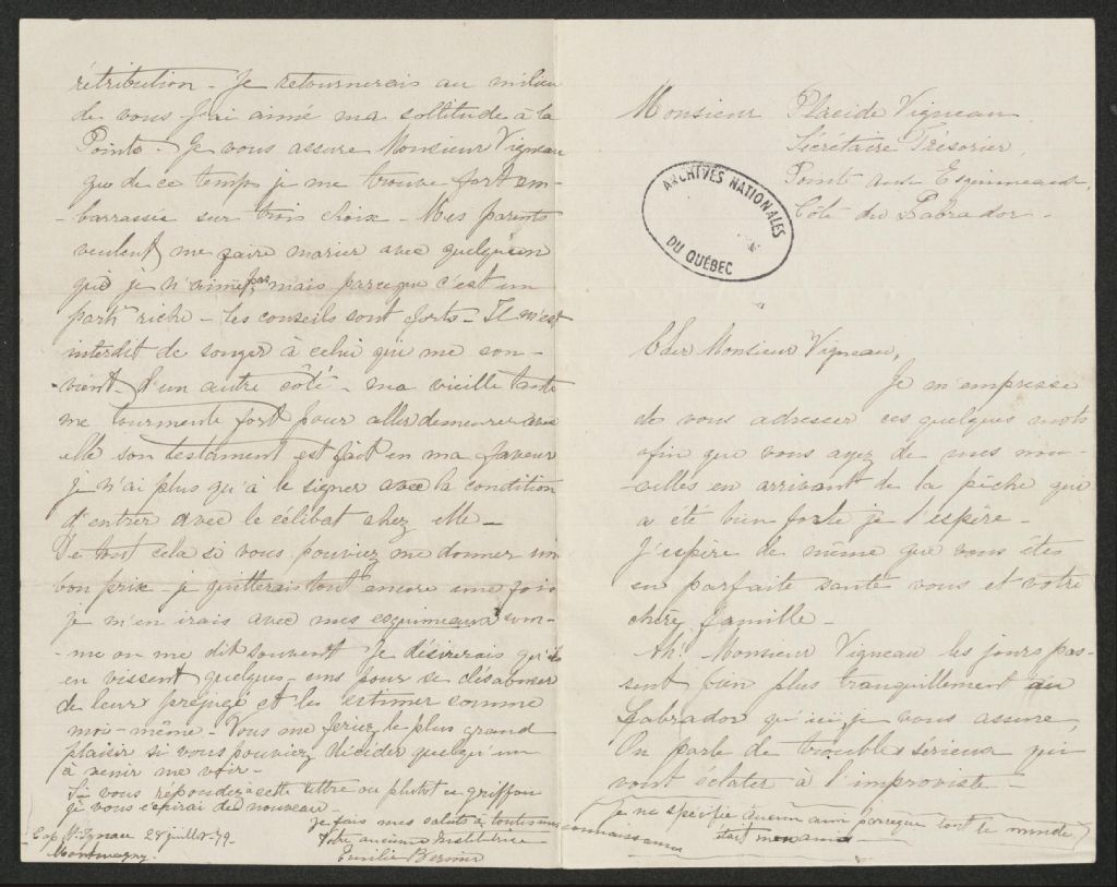 - Le dossier contient de la correspondance personnelle de Placide Vigneau en provenance de l'institutrice Émilie L. Bernier, qui enseigna à Pointe-aux-Esquimaux de juin 1878 à juin 1879 à l'école de l'arrondissement no. 2. La correspondance, en provenance de Cap-Saint-Ignace et de Sainte-Pétronille, concerne des nouvelles politiques, la construction d'une nouvelles église à Cap-Saint-Ignace, le désir de retourner à la Pointe-aux-Esquimaux, projets de mariage et son mariage avec Louis Ferland à Québec en 1880, projets d'aller vivre avec sa tante, enseignement dans le nord de Montréal, nouvelles sur la santé, projets d'aller enseigner aux Îles-de-la-Madeleine, nouvelles générales.
