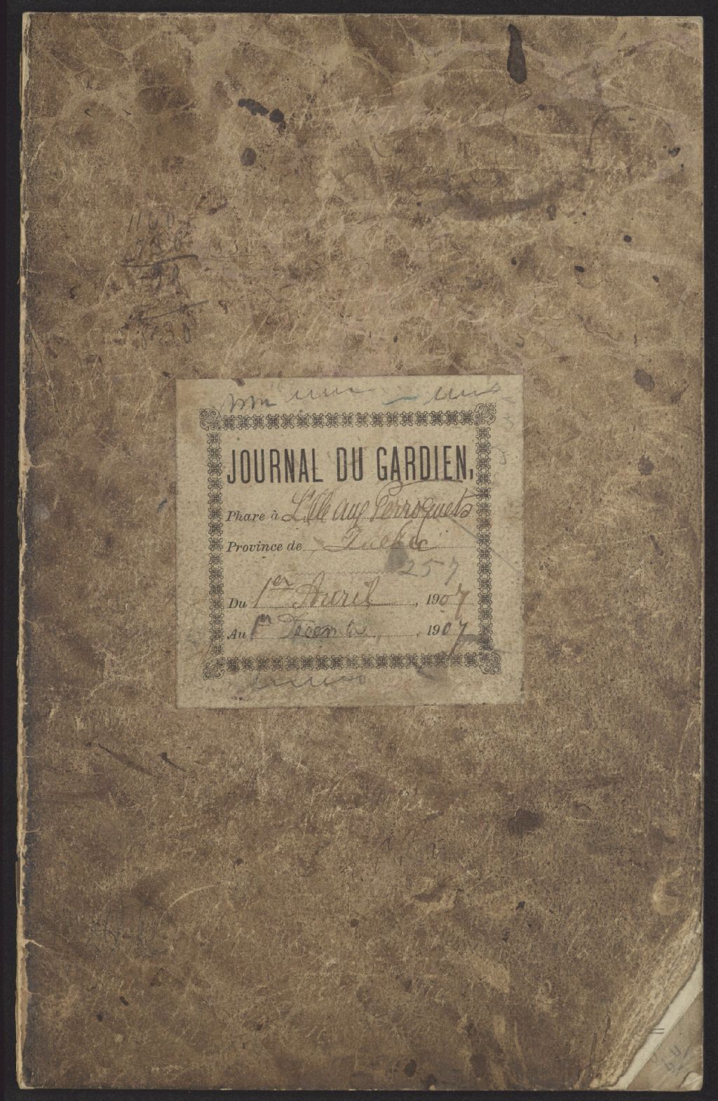 - Journal du Ministère de la Marine et des Pêcheries (Canada) tenu par le gardien du phare de l'île aux Perroquets, Placide Vigneau, du 23 mars au 1er décembre 1907. Le gardien consigne les informations relatives aux conditions météorologiques, le temps d'utilisation de la lumière, la quantité d'huile utilisée et autres remarques (arrivée, absences, départ).