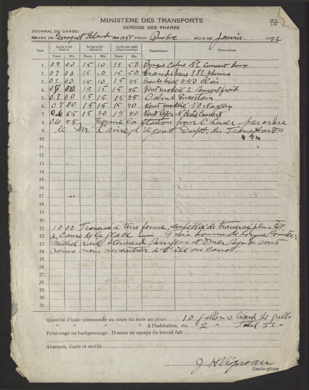 - Journal du service des phares du Ministère des Transports (Canada) tenu par le gardien du phare de l'île aux Perroquets, Hector Vigneau, 1er janvier 1942 au 1er avril 1945. Le gardien consigne les informations relatives aux conditions météorologiques, le temps d'utilisation de la lumière, la quantité d¿huile consommée, travaux de peinture et autres remarques (arrivée, absences, travaux, navigation, départ). Le dossier contient des notes concernant le nombre d'heures de fonctionnement du signal de brume et le pétrole consommé entre 1929 et 1944.
