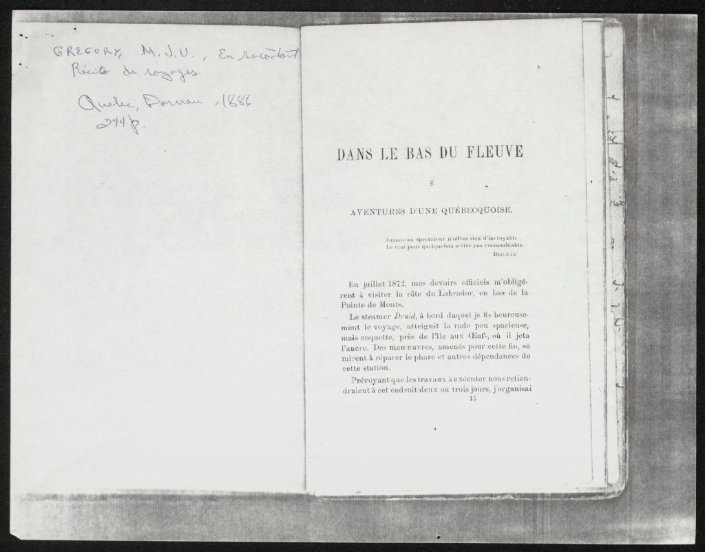 - Le dossier contient une photocopie d¿un écrit de Placide Vigneau de 1894 et de 1896 au sujet de Mathilde Blais, fille de François Blais de Berthier et épouse de François Guitony puis épouse d¿Adolphe Dufour. Mathilde Blais est le personnage du chapitre « Dans le bas du fleuve : aventures d¿une québecquoise » du livre « En racontant : récits de voyages en Floride, au Labrador et sur le fleuve Saint-Laurent » de John Uriah Gregory. Le dossier contient également une photocopie du chapitre du livre.