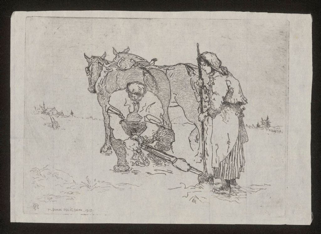 [Couple de paysans et chevaux de trait travaillant au labour] /