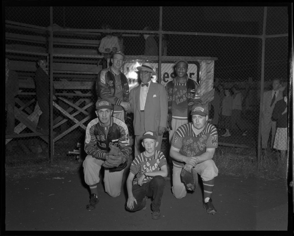 Quatre joueurs de balle molle, 31 juillet 1954, Archives nationales à Rimouski, Fonds J.-Gérard Lacombe, (01R,P24,S3,SS7,D283), J.-Gérard Lacombe.