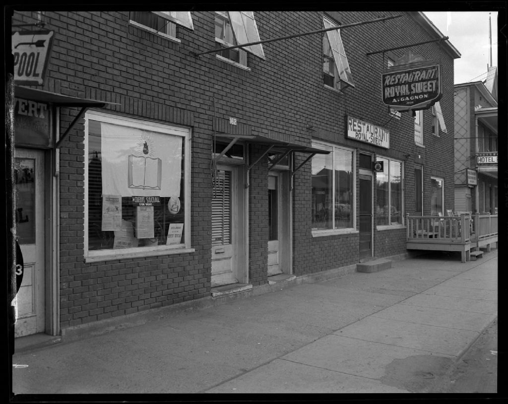 Vitrine Crédit Social, 1 août 1954, Archives nationales à Rimouski, Fonds J.-Gérard Lacombe, (01R,P24,S3,SS7,D286), J.-Gérard Lacombe.