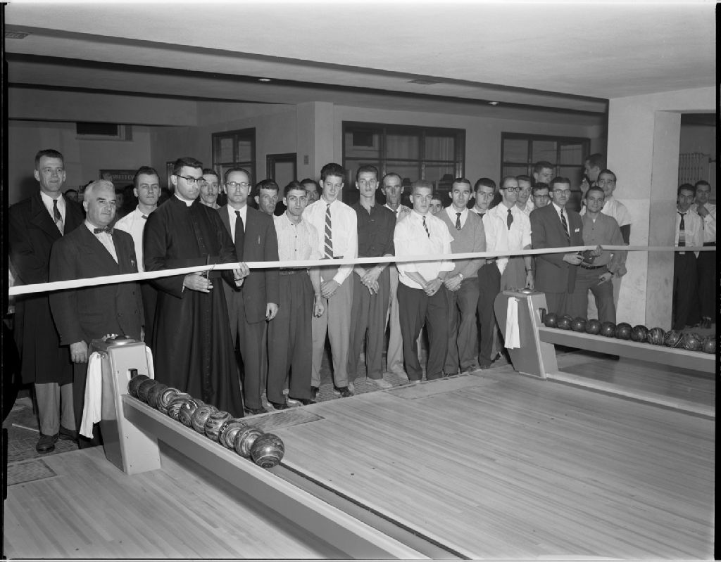Ouverture de la salle de Quilles au centre des Loisirs St-Germain, 19 septembre 1955, Archives nationales à Rimouski, Fonds J.-Gérard Lacombe, (01R,P24,S3,SS7,D416), J.-Gérard Lacombe.
