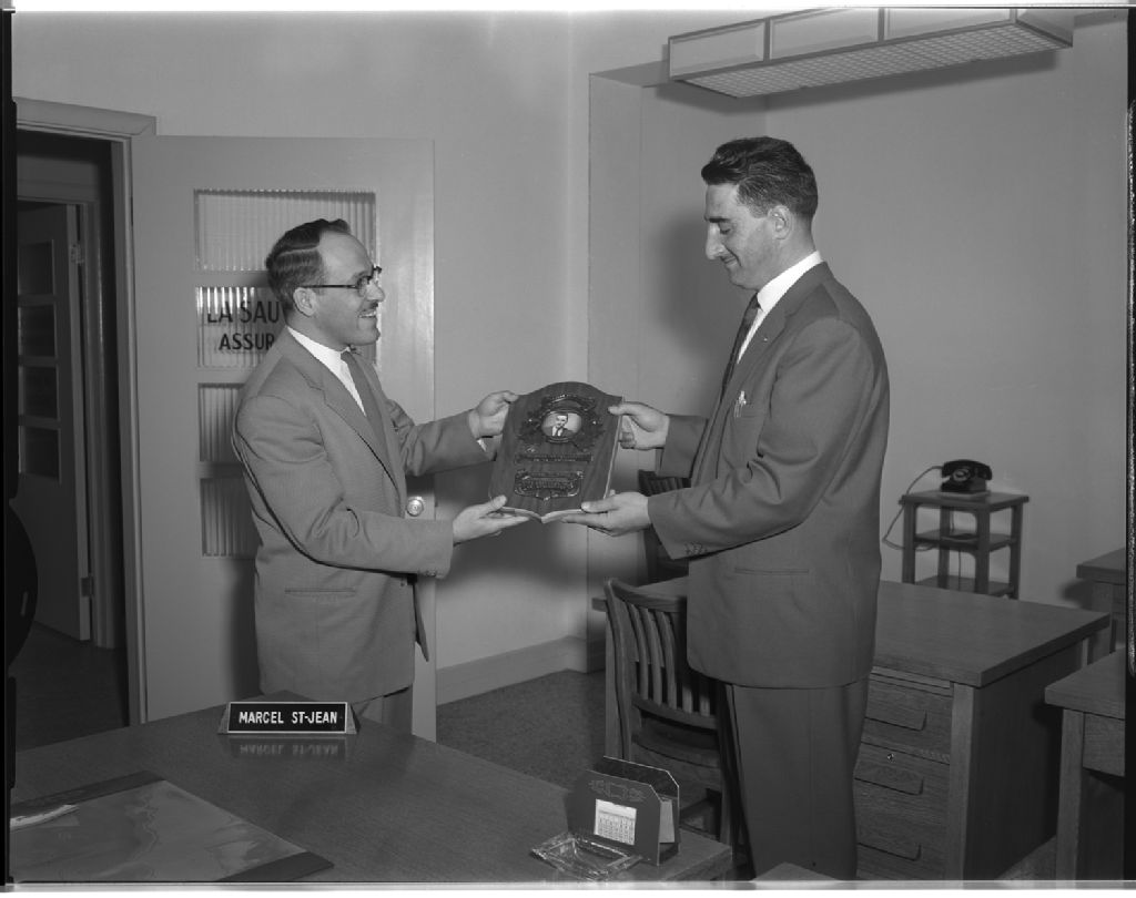 Remise d'un trophée de La Sauvegarde à Marcel St-Jean, 19 avril 1956, Archives nationales à Rimouski, Fonds J.-Gérard Lacombe, (01R,P24,S3,SS7,D451), J.-Gérard Lacombe.