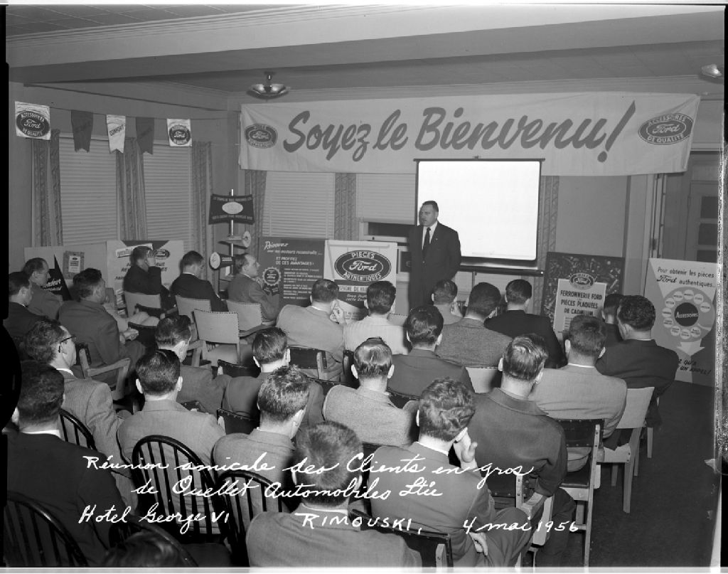 Réunion amicale des clients en gros de Ouellet Automobile Rimouski, 4 mai 1956, Archives nationales à Rimouski, Fonds J.-Gérard Lacombe, (01R,P24,S3,SS7,D456), J.-Gérard Lacombe.
