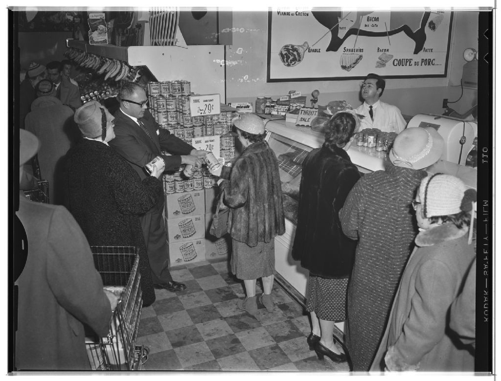 Démonstration des produits Catteli-Habitant, 29 novembre 1957, Archives nationales à Rimouski, Fonds J.-Gérard Lacombe, (01R,P24,S3,SS7,D538), J.-Gérard Lacombe.