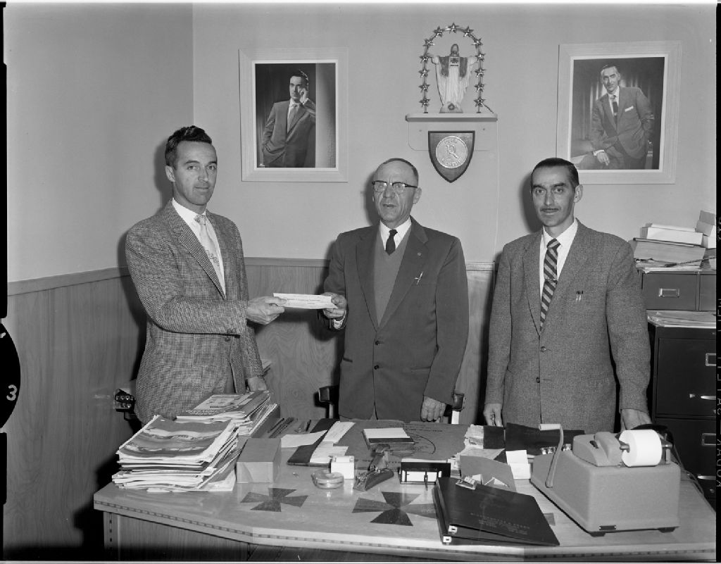 Remise d'un chèque par la maison Bissonnette & Frère, 10 septembre 1958, Archives nationales à Rimouski, Fonds J.-Gérard Lacombe, (01R,P24,S3,SS7,D598), J.-Gérard Lacombe.