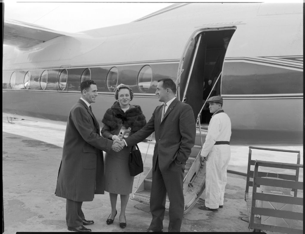 Départ à l'aéroport de Rimouski d'Edmond Garon et sa femme [?] Fournier, 13 octobre 1960, Archives nationales à Rimouski, Fonds J.-Gérard Lacombe, (01R,P24,S3,SS7,D709), J.-Gérard Lacombe.