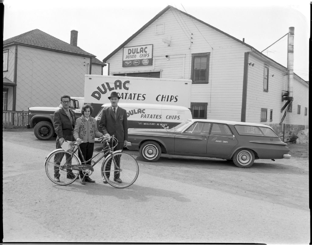 Francine Saint-Pierre, gagnante d'un bicycle au concours de Dulac Patates Chips, Avril 1963, Archives nationales à Rimouski, Fonds J.-Gérard Lacombe, (01R,P24,S3,SS7,D898), J.-Gérard Lacombe.