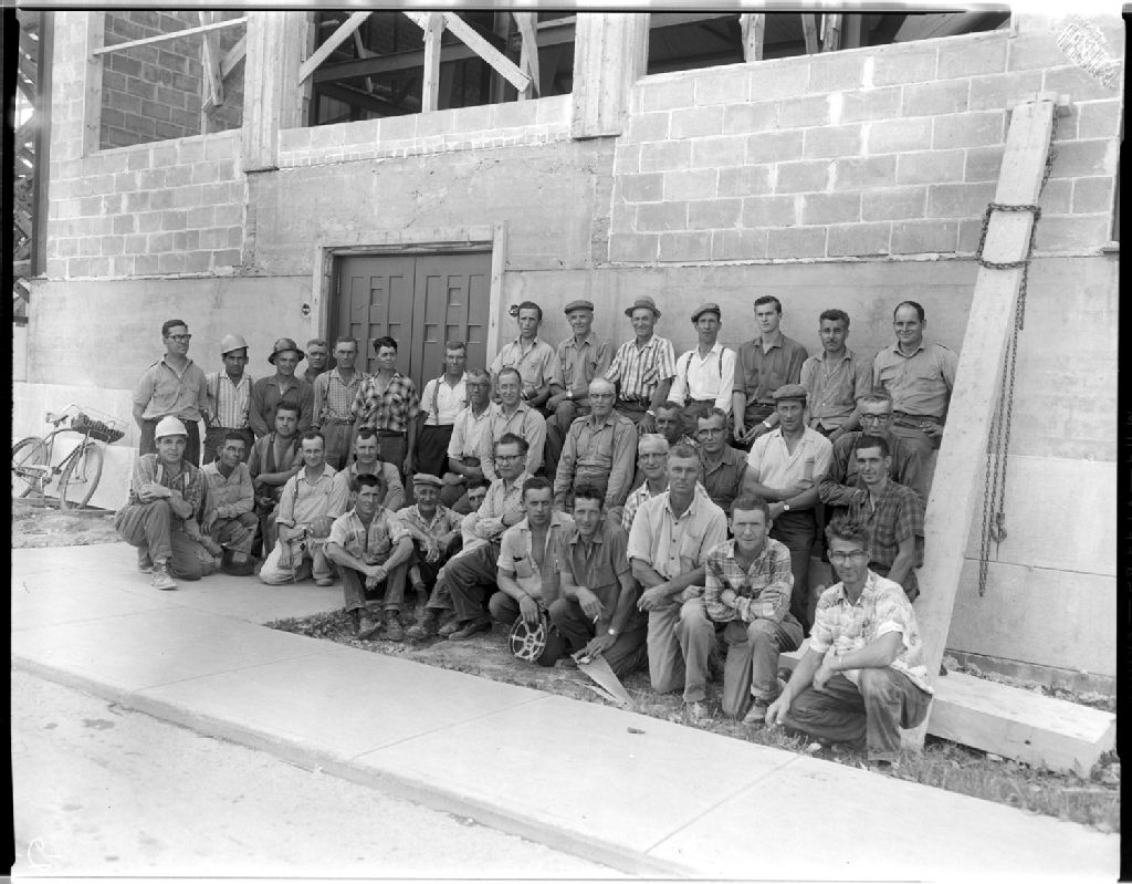 Ouvriers pour la construction de la nouvelle église de Saint-Robert, Juillet 1963, Archives nationales à Rimouski, Fonds J.-Gérard Lacombe, (01R,P24,S3,SS7,D923), J.-Gérard Lacombe.