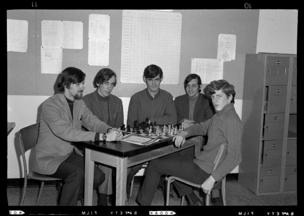 Cinq moniteurs du club d'échec, Avril 1970, Archives nationales à Rimouski, Fonds J.-Gérard Lacombe, (01R,P24,S3,SS7,D981), J.-Gérard Lacombe.