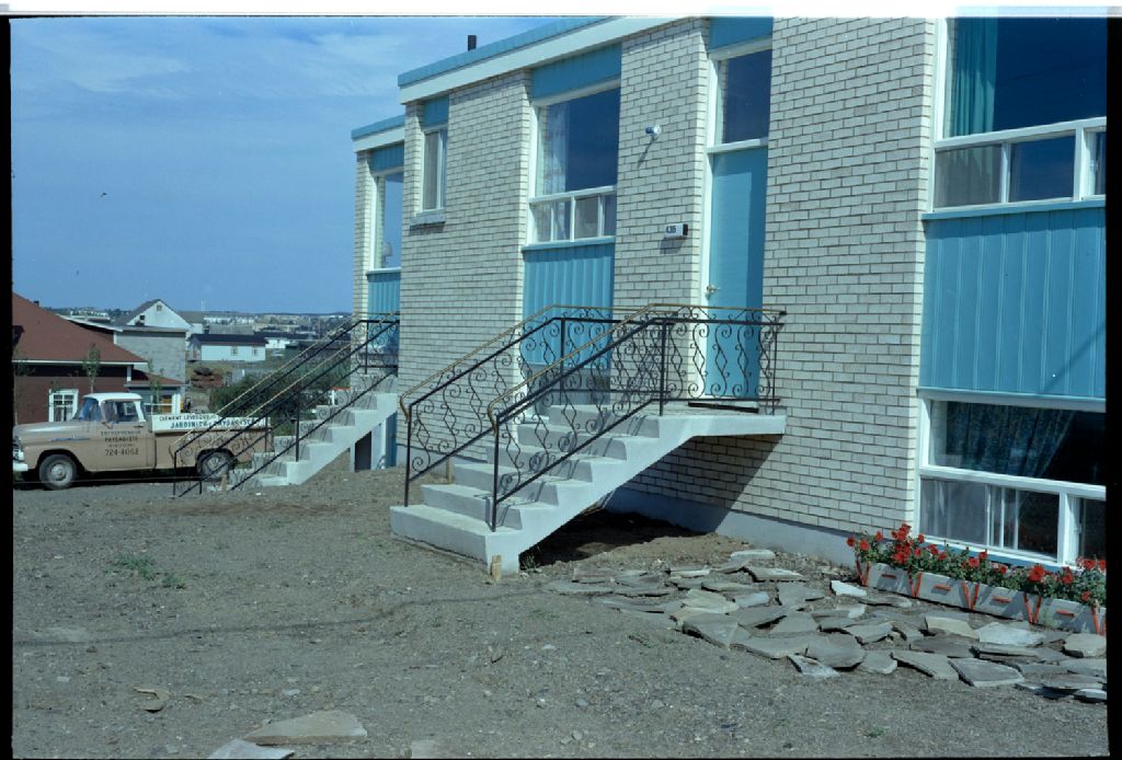 Rampe d'escalier en fer ornemental chez Charles Lepage, Août 1970, Archives nationales à Rimouski, Fonds J.-Gérard Lacombe, (01R,P24,S3,SS7,D989), J.-Gérard Lacombe.