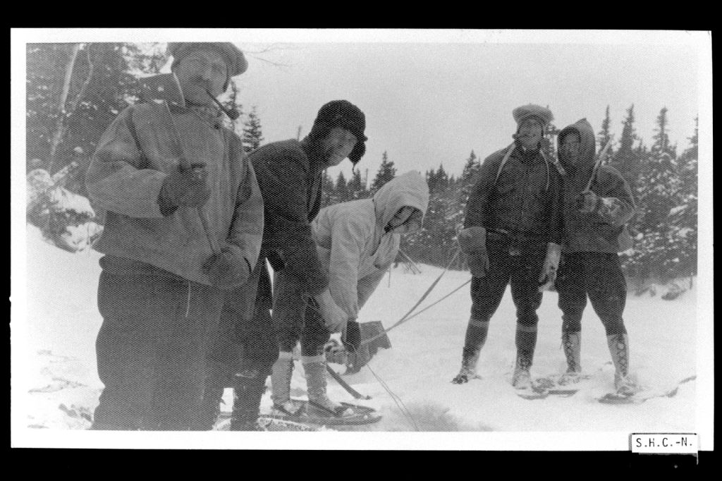 Groupe de montagnais, Négatif reproduit en 1980 (original créé entre 1950 et 1980), Archives nationales à Sept-Îles, Fonds Société historique de la Côte-Nord inc., (09N,P8,S1,P210), Société historique de la Côte-Nord.