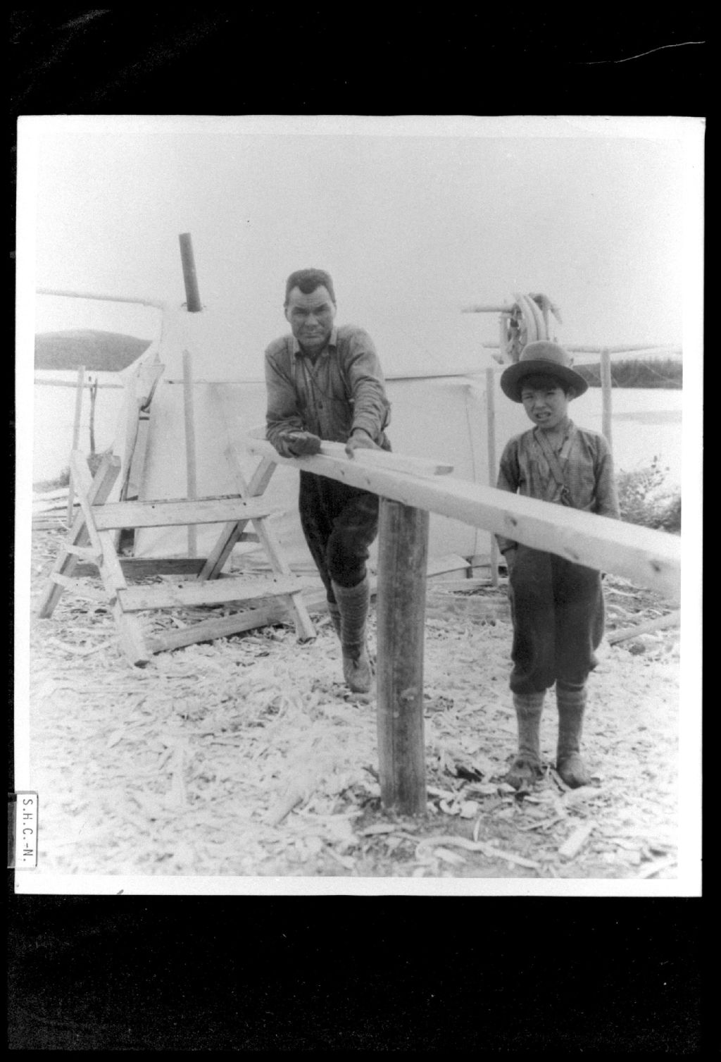 Montagnais équarrissant un billet, Négatif reproduit en 1980 (original créé entre 1920 et 1950), Archives nationales à Sept-Îles, Fonds Société historique de la Côte-Nord inc., (09N,P8,S1,P211), Société historique de la Côte-Nord.