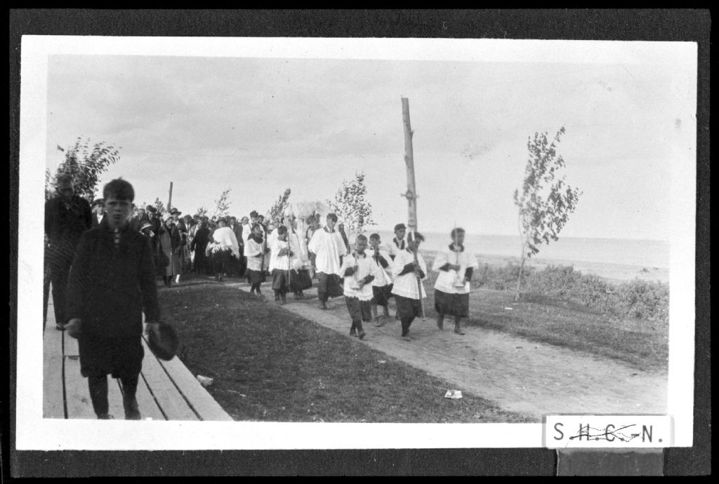 Fête des indiens, Négatif reproduit en 1980 (original créé en 1926), Archives nationales à Sept-Îles, Fonds Société historique de la Côte-Nord inc., (09N,P8,S1,P412), Société historique de la Côte-Nord.