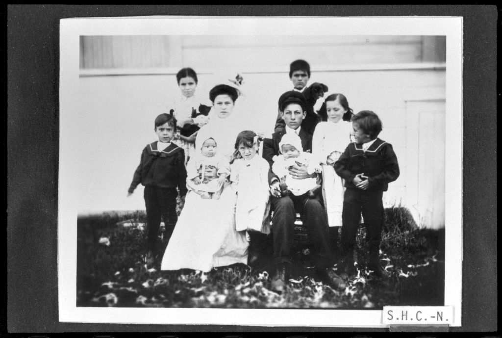 Famille indienne, Négatif reproduit en 1980 (original créé entre 1950 et 1980), Archives nationales à Sept-Îles, Fonds Société historique de la Côte-Nord inc., (09N,P8,S1,P434), Société historique de la Côte-Nord.