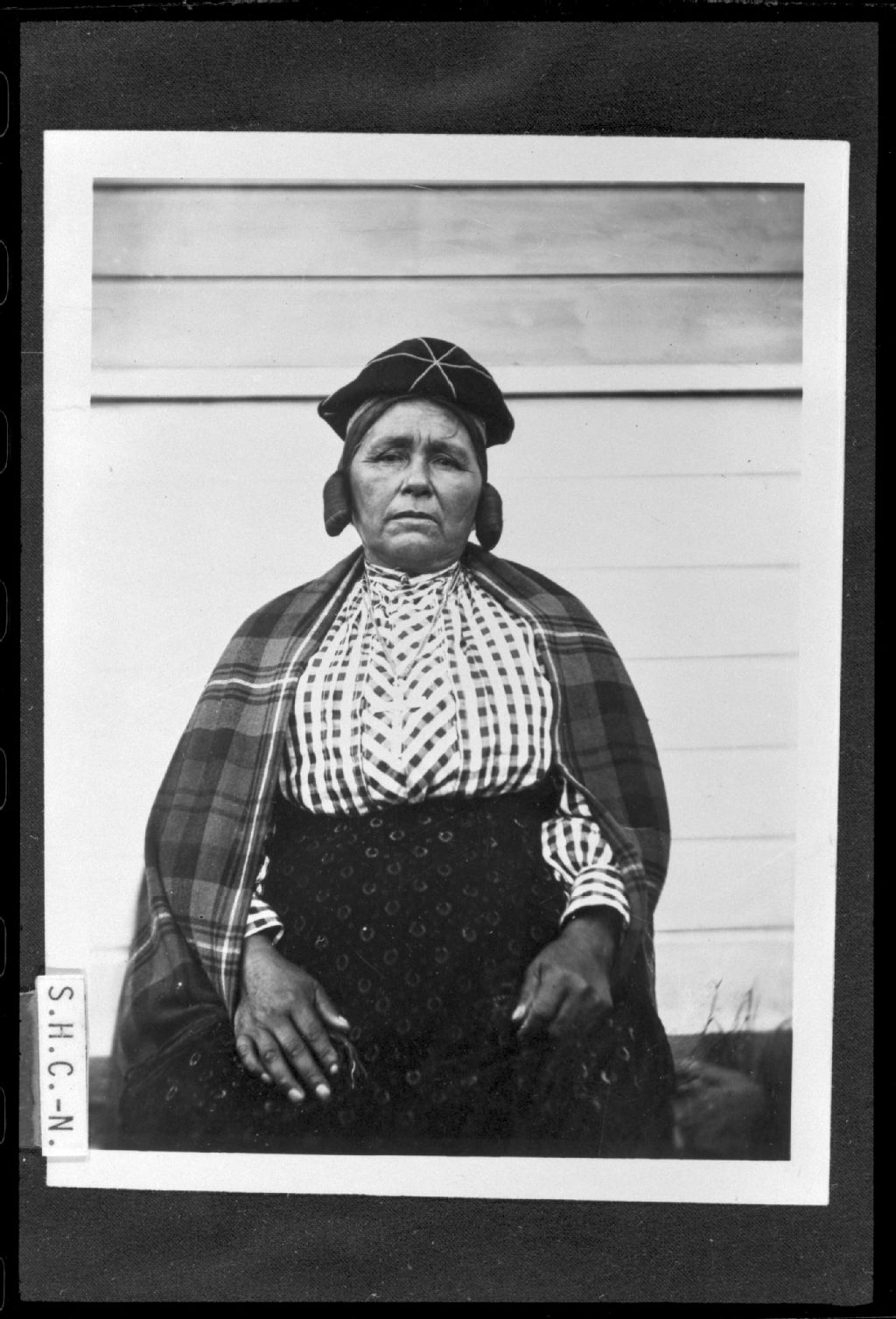 Femme indienne, Négatif reproduit en 1980 (original créé entre 1950 et 1980), Archives nationales à Sept-Îles, Fonds Société historique de la Côte-Nord inc., (09N,P8,S1,P436), Société historique de la Côte-Nord.